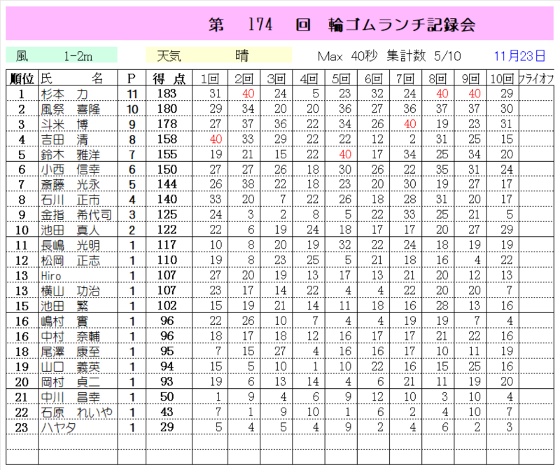 でもこうしてみんなでワイワイ原っぱで楽しくヒコーキ 飛ばせて幸せです。事故も無く終われてサイコーです! 昭和の時代からずっと続いている輪ゴムランチ だんだん見えにくいお年頃になってきていますが 若いみなさんにちょっと頼りながらこれからも 続けていきましょう 今年の輪ゴムランチはこれで終了です 来月は表彰式と忘年会です いつものブルーシートがみなさまをお待ちいたしております